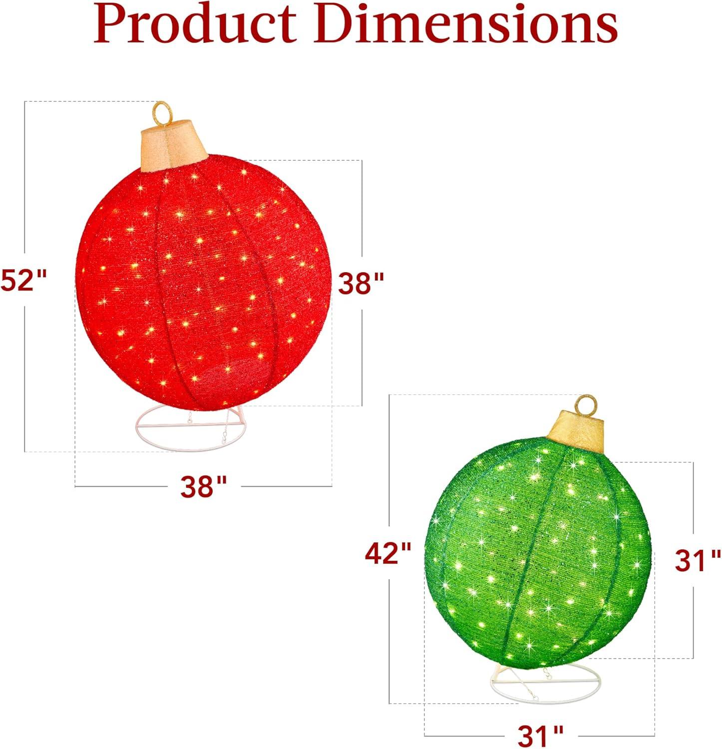 PRE-LIT ORNAMENT SET: Brighten your yard, porch, or indoor display setting with two unique and extra-large (52in & 42in) ornaments