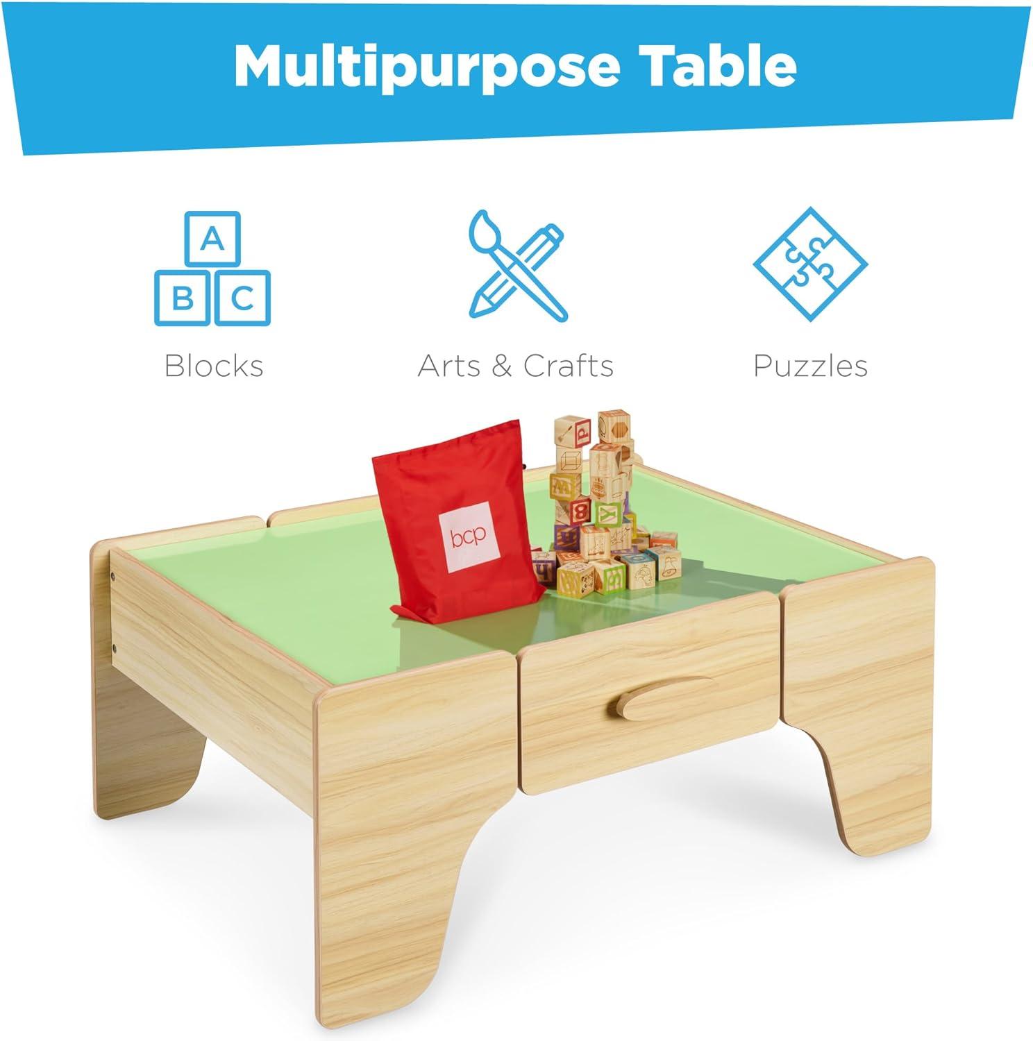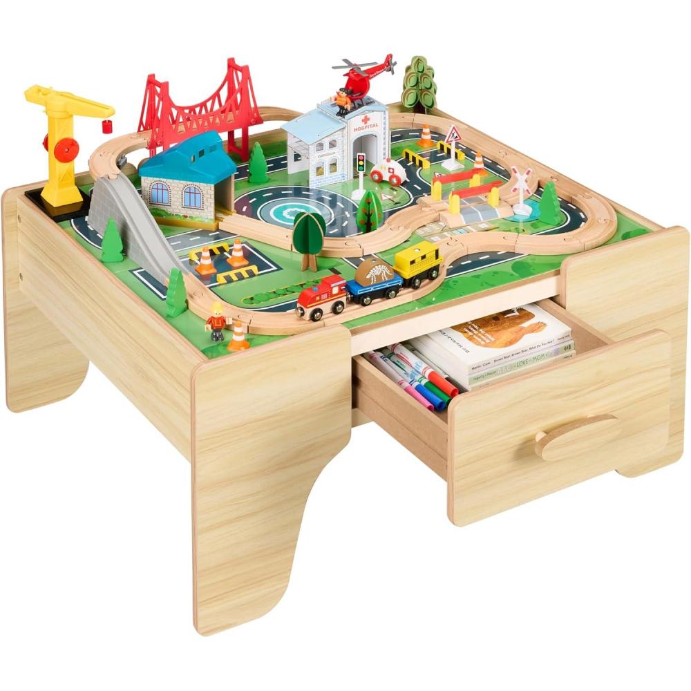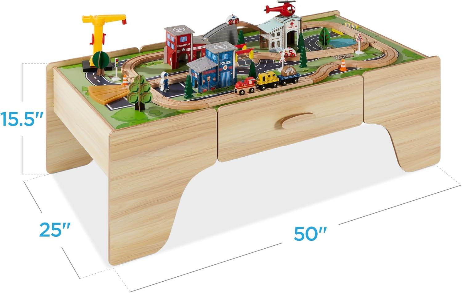 Best Choice Products 56 Piece Wooden Train Table Set for Kids (32"x23.25"x15") Multi-Activity Table with Toy Storage Drawer & Reversible Top - Natural(Natural)
