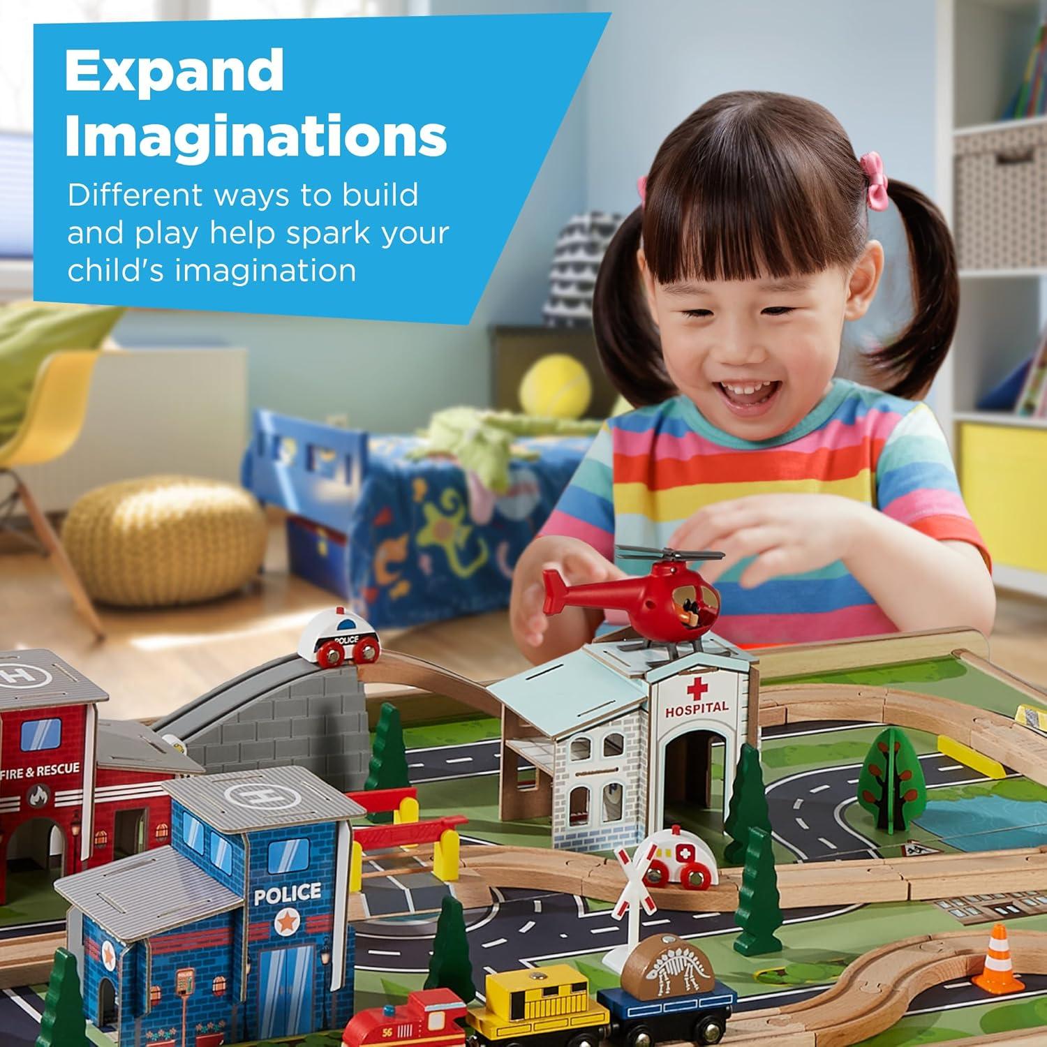 ACCESSORY-PACKED SET: Includes trains, bridges, buildings, vehicles & more-everything your child needs for creative, hands-on play.