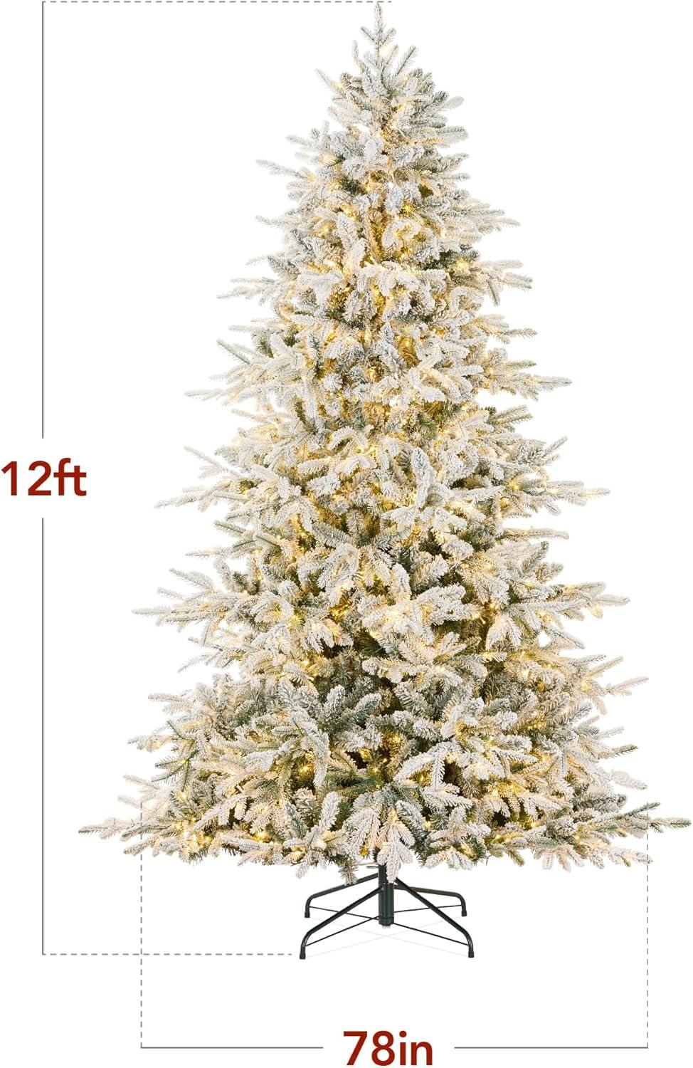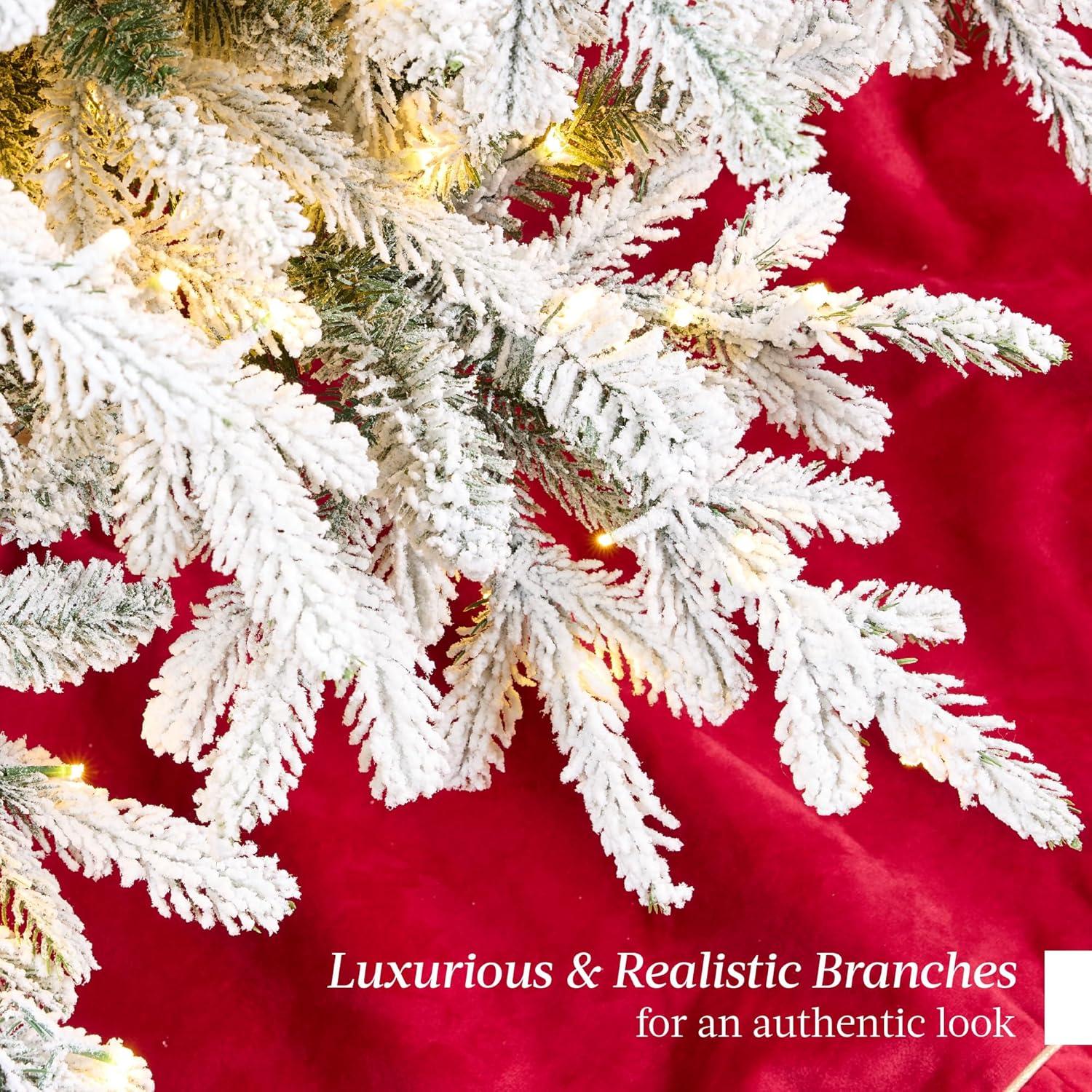SNOW-FLOCKED NOBLE FIR: Experience a white Christmas as the vibrant green PE & PVC horizontal branches are beautifully enhanced by a snow-flocked finish capturing a rich, realistic appearance! Number of tips; (6ft/7.5ft/9ft/12ft): 2,252/3,000/3,880/6,200