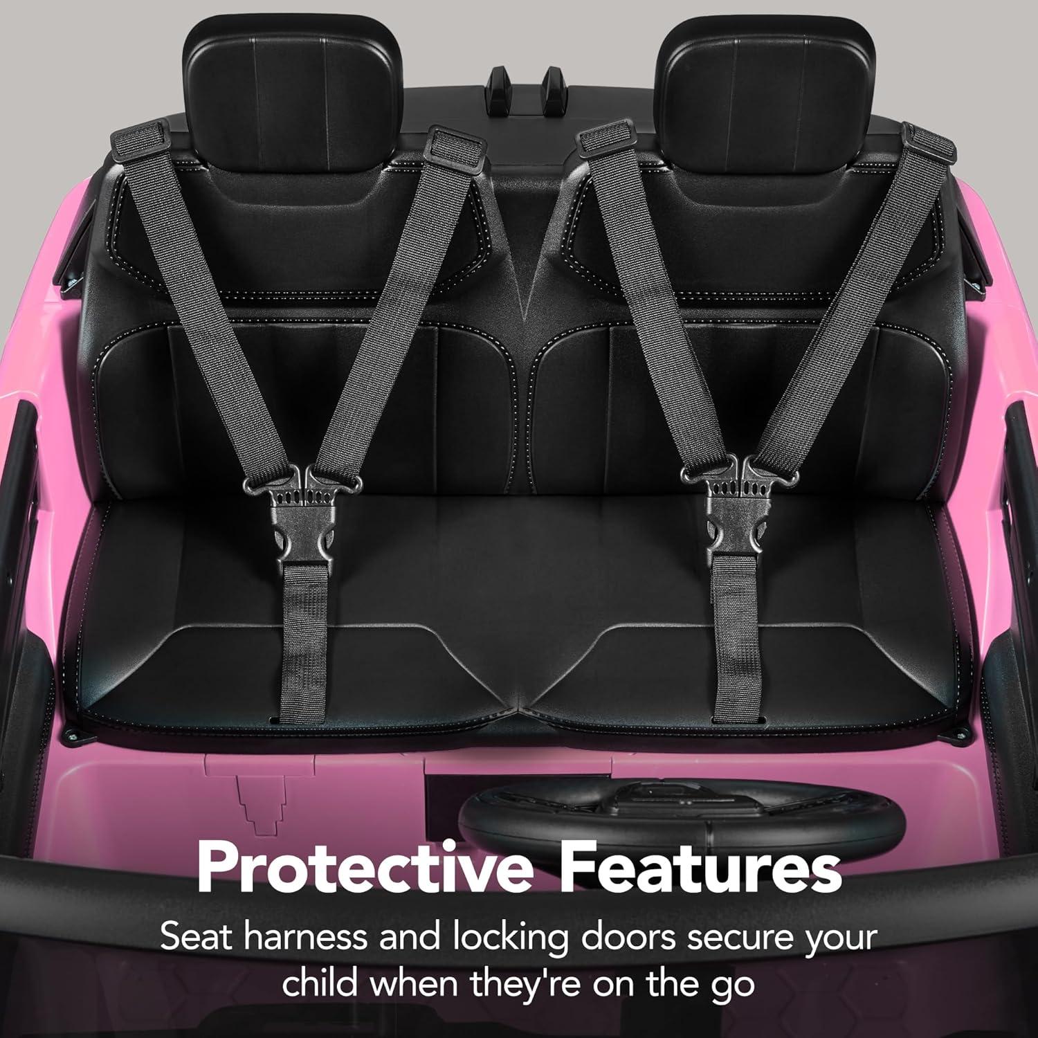 TWO SEATER FOR AGES 3-8: Built with your child's protection in mind, this 2-seater ride-on features individual adjustable seat harnesses, treaded plastic wheels for extra grip, bright LED headlights, and a 2-wheel suspension system for a smooth, secure ride.