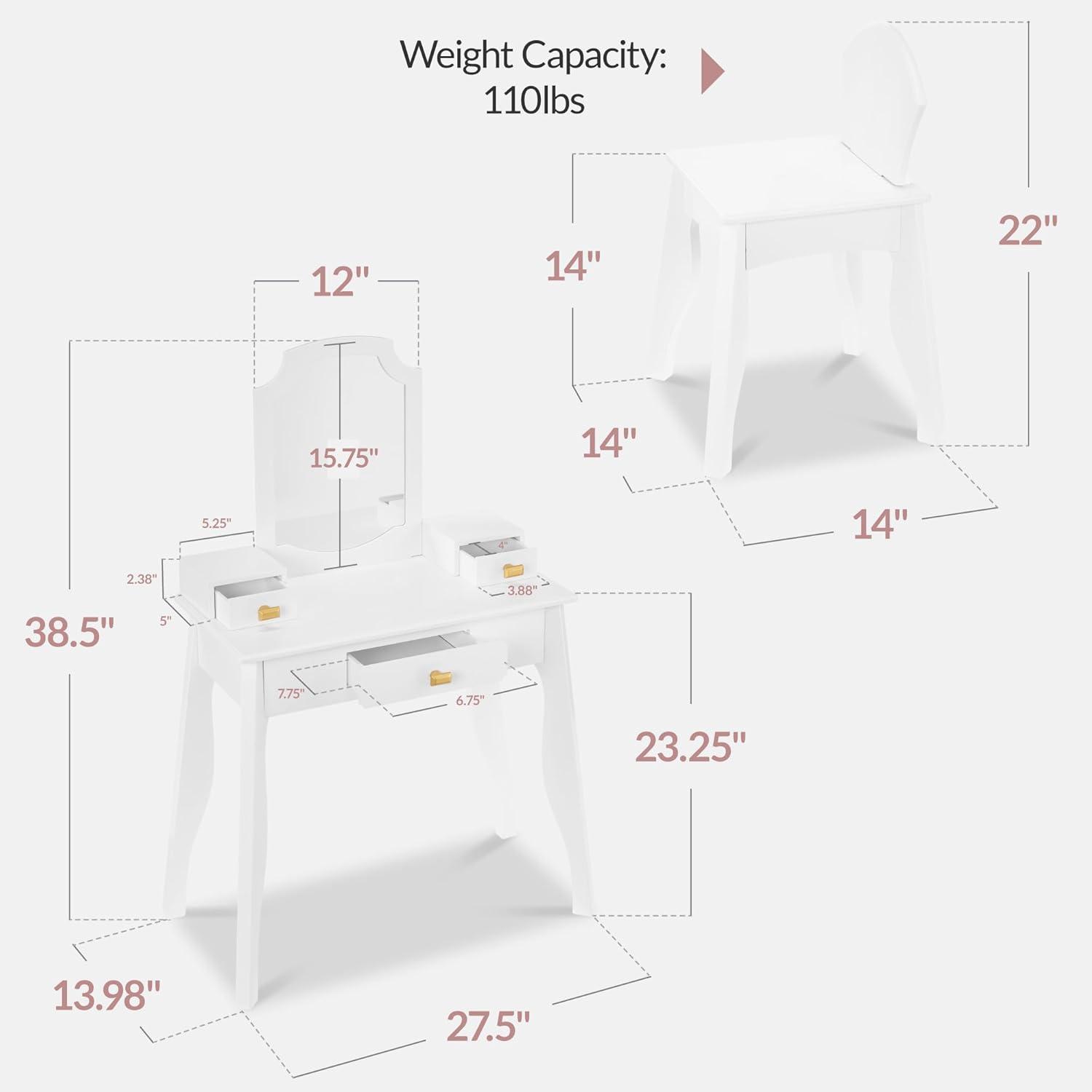 &lessthan;b&greaterthan;Specifications:&lessthan;/b&greaterthan; &lessthan;br&greaterthan;Vanity Dimensions: 38.5″(L) x 27.5″(W) x 13.95″(H) &lessthan;br&greaterthan;Floor to Vanity Counter: 23.25″(H) &lessthan;br&greaterthan;Chair Dimensions: 14″(L) x 14″(W) x 22″(H) &lessthan;br&greaterthan;Floor to Seat Height: 14″ “(H) &lessthan;br&greaterthan;Product Weight: 28 lbs. &lessthan;br&greaterthan;Material: MDF, Acrylic &lessthan;br&greaterthan;Recommended for ages: 3+ Years &lessthan;br&greaterthan;Assembly required (with instructions) &lessthan;br&greaterthan; &lessthan;br&greaterthan; &lessthan;b&greaterthan;Package Includes:&lessthan;/b&greaterthan; &lessthan;br&greaterthan;Vanity &lessthan;br&greaterthan;Chair &lessthan;br&greaterthan; &lessthan;br&greaterthan; &lessthan;br&greaterthan;For Residential Use Only&lessthan;p&greaterthan;ASTM-certified&lessthan;/p&greaterthan;&lessthan;p&greaterthan;BCP SKU: SKY10593&lessthan;/p&greaterthan;