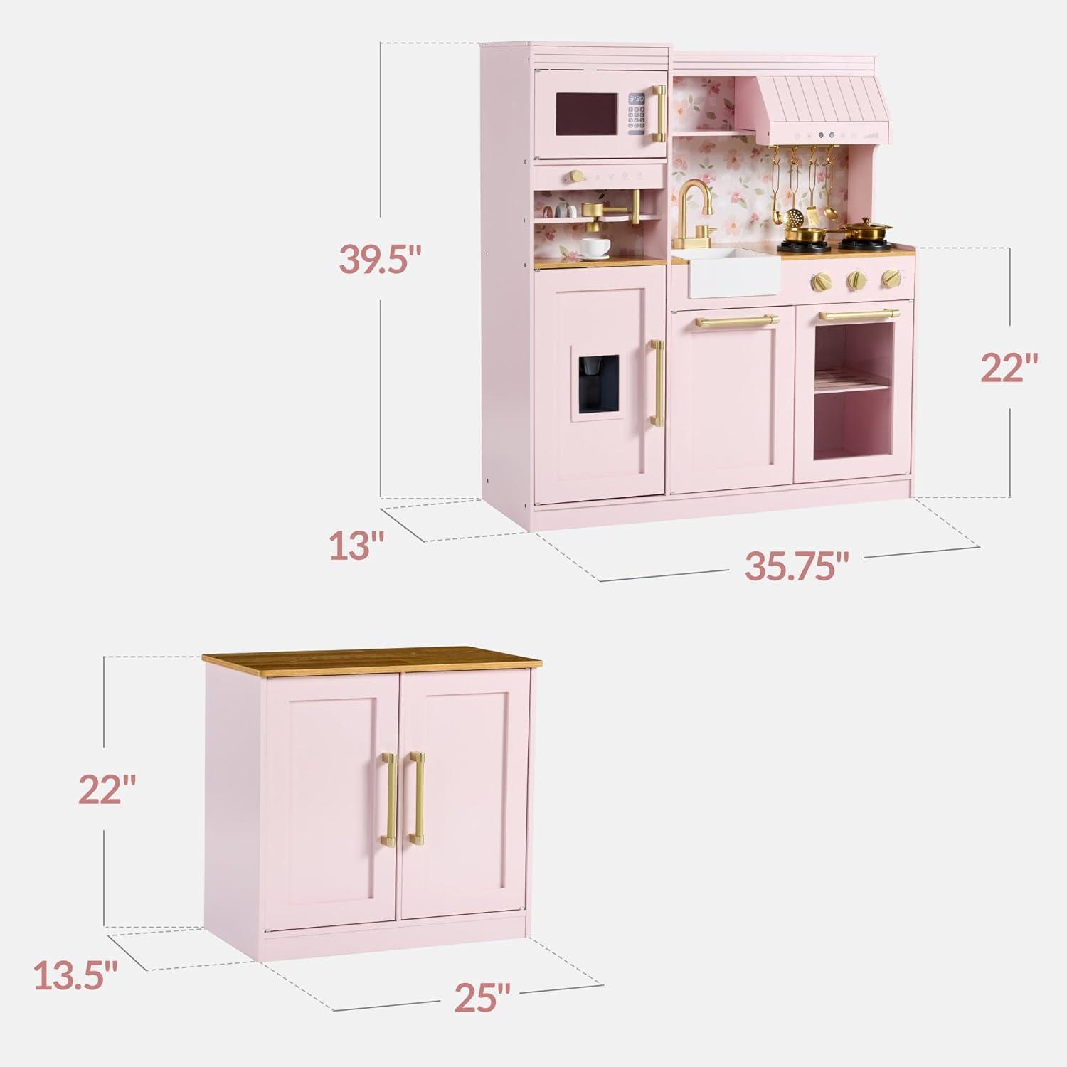 SPARKS IMAGINATION: The Deluxe Kitchen with Island Set promotes imaginative play, providing children with the opportunity to engage in creative activities such as cooking, preparing coffee, and sharing with friends and family, serving as an ideal tool for fostering creativity, storytelling, and meaningful social interaction.; OVERALL DIMENSIONS: 35.75″L x 13″W x 39.5″H (Kitchen); 25″L x 13.5″W x 22″H (Island)