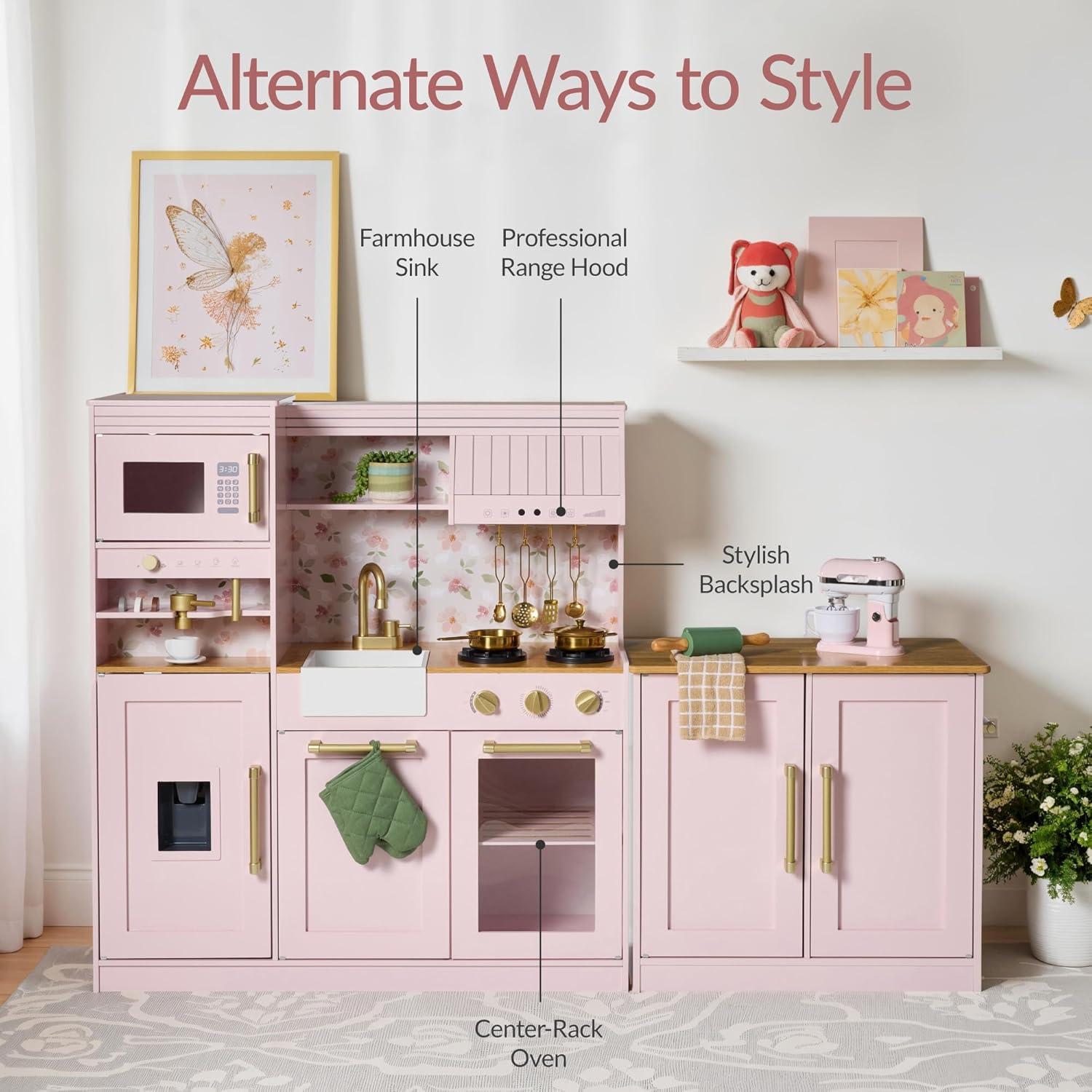 DELUXE SHAKER-STYLE KITCHEN SET WITH FUNCTIONAL ISLAND: A modern play kitchen featuring timeless shaker cabinets, gold hardware, and a movable island with storage cubbies and a built-in towel rack – perfect for creating a designer-inspired playroom and keeping accessories organized during, and after, play.