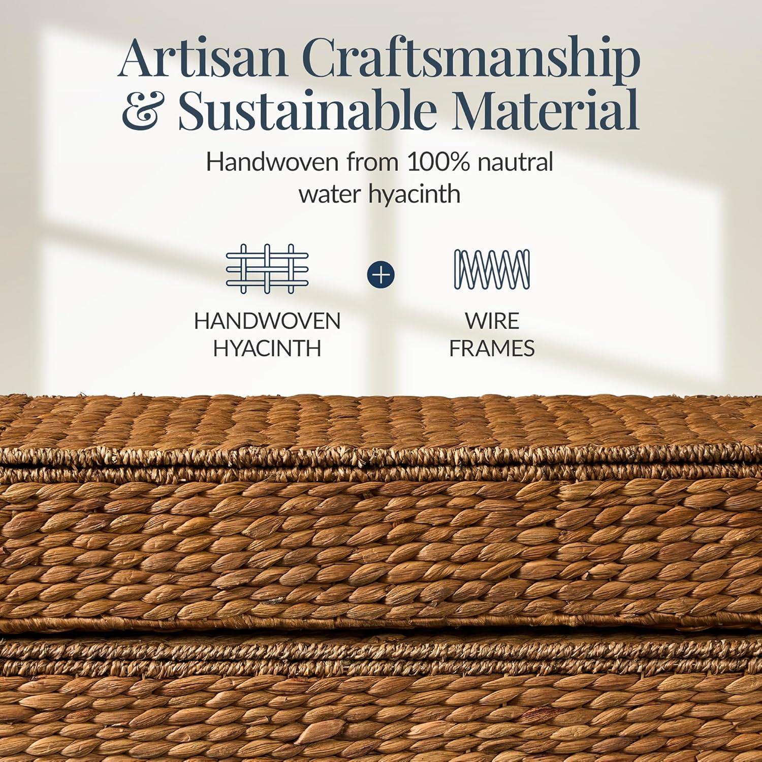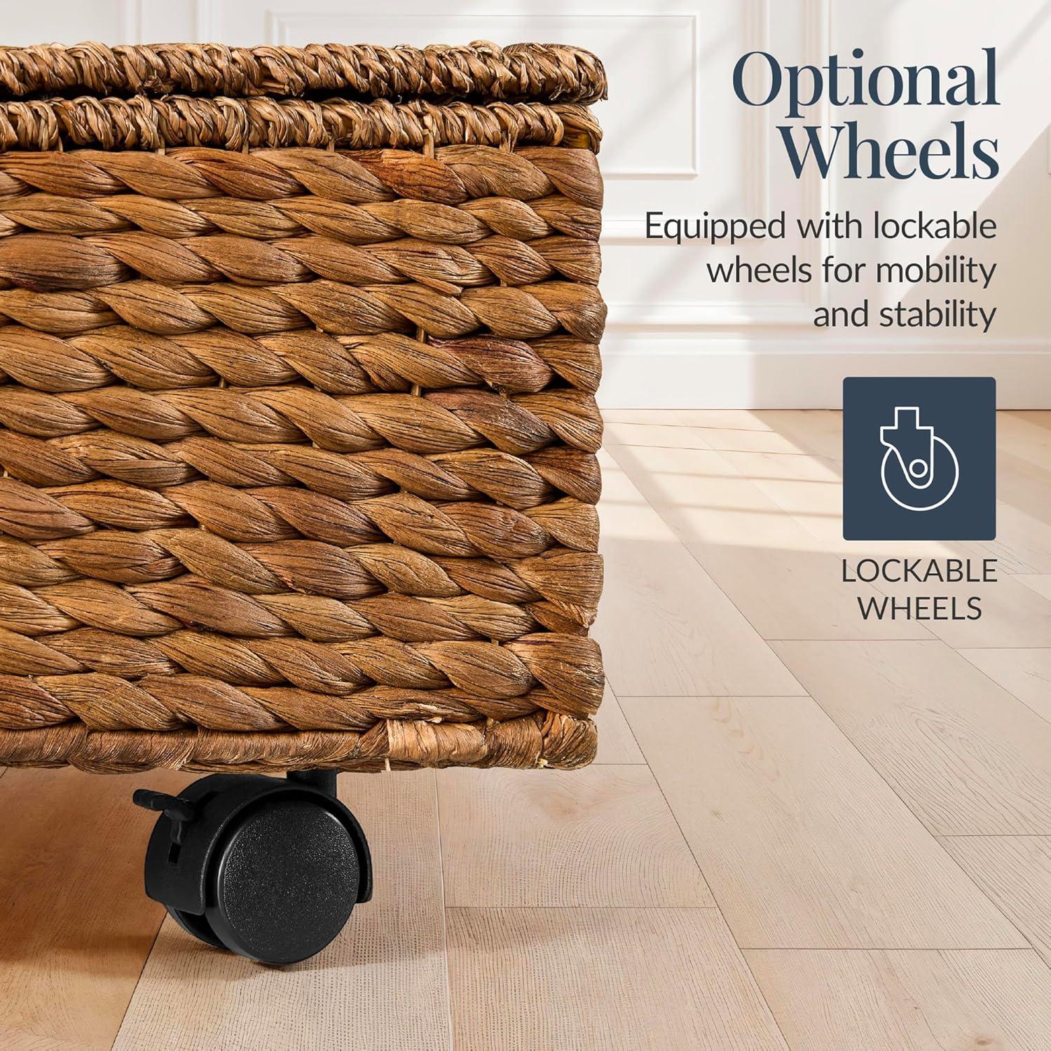 ARTISAN CRAFTSMANSHIP & SUSTAINABLE MATERIALS: Handwoven from 100% natural water hyacinth in Vietnam. Each piece is unique, with slight size and color variations. A natural earthy scent may be present and will fade within 24–72 hours.; OVERALL DIMENSIONS: MEDIUM: 24″L x 15″W x 5″H (without wheels), 24″L x 15″W x 7″H (with wheels); LARGE: 30″L x 20″W x 6.7″H (without wheels), 30″L x 20″W x 8.7″H (with wheels); Weight Capacity: 44lbs (each)